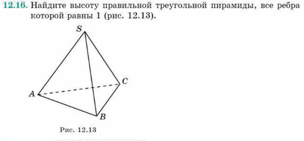 12.16. Найдите высоту правильной треугольной пирамиды, все ребра которой равны 1 (рис. 12.13).