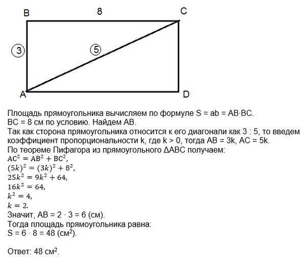 . Сторона прямоугольника относится к его диагонали как 3 : 5, а другая сторона равна 8 см. Найдите площадь прямоугольника.