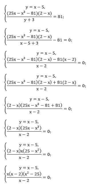 [m] \left\{ \begin{array}{l} \frac{xy + 7x}{y + 5} = x + 2, \\ \\ 0,5 \log_3 \left( \frac{25x - x^3 - 81}{y + 3} \right) = 2 - \log_9(2 - x). \end{array} \right. [/m]