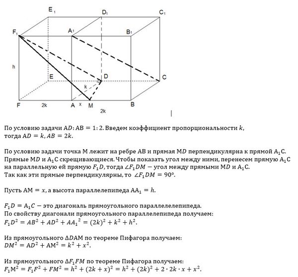 в прямоугольном параллелепипеде abcda1b1c1d1 известно что ad : ab=1 : 2. на ребре ab обозначили точку m так, что прямая md перпендикулярна к прямой a1c. найти отношение am : mb.