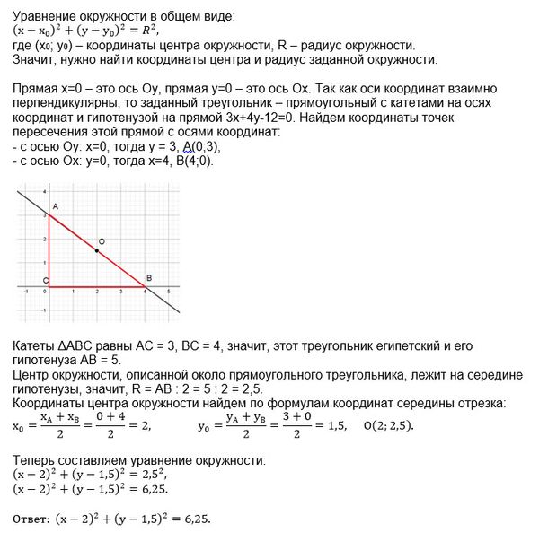 Составить уравнение окружности описанной около треугольника стороны которого лежат на прямых:. X=0 Y=0 3x+4y-12=0