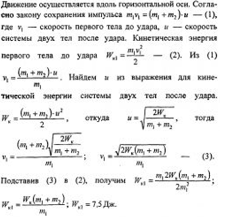 Тело массой m, = 5 кг ударяется о неподвижное тело массой m2 = 2,5 кг. Кинетическая энергия системы двух тел непосредственно после удара стала W'k = 5 Дж. Считая удар центральным и неупругим, найти кинетическую энергию W'k первого тела до удара.