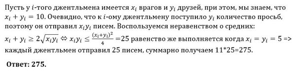 В городе Джельмантауне живут 11 джентльменов, любые двое из которых любо дружат, либо враждуют. В какой-то момент каждый джентльмен попросил каждого из своих друзей послать открытку ненависти каждому врагу. Каждый из джентльменов выполнил все просьбы, при этом он послал каждому из своих врагов такое количество открыток сколько раз его об этом попросили. Какое наибольшее количество открыток могло быть послано?