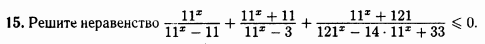 Решите неравенство 11^x/(11^x-11)+(11^x+11)/(11^x-3)+(11^x+121)/(121^x-14*11^x+33) меньше или равно 0