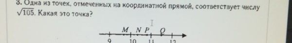 Число sqrt(105 )лежит между числами 10 и 11. Там две точки - N и P. 10<sqrt(105)<11, sqrt(100)<sqrt(105)<sqrt(121), так как 105 ближе к 100, чем к 121, то sqrt(105) ближе к 10, чем к 11, значит, это точка N.