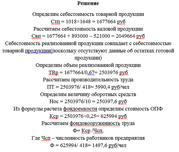 В расчетном периоде предприятие имеет следующие показатели: расходы на незавершенное производство на начало года составляют 521 тыс. руб., на конец – 893 тыс. руб., годовой объем производства товара А – (1000 + N) шт., коэффициент оборачиваемости оборотных средств – 10, фондоемкость ОПФ – 0,25.Численность работников предприятия – (400 + N) чел., затраты на один рубль реализованной продукции составили 0,67 руб., полная себестоимость товара А – (1630 + N) руб./шт. Рассчитать себестоимость товарной и валовой продукции, производительность труда, величину оборотных