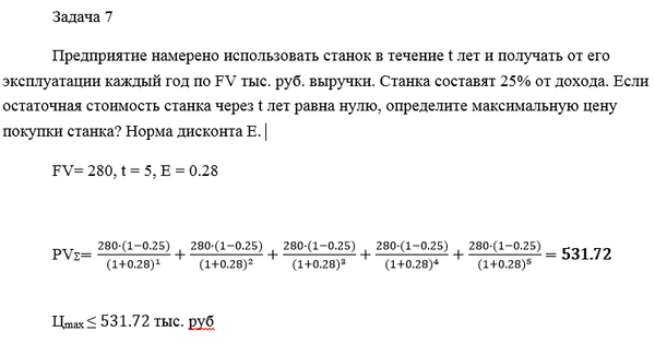 Предприятие намерено использовать станок в течение 5 лет и получать от его эксплуатации каждый год по 280 тыс. руб. выручки. С танка составят 25% от дохода. Если остаточная стоимость станка через t лет равна нулю, определите максимальную цену покупки станка? Норма дисконта 0,28. Данные представлены в таблице.