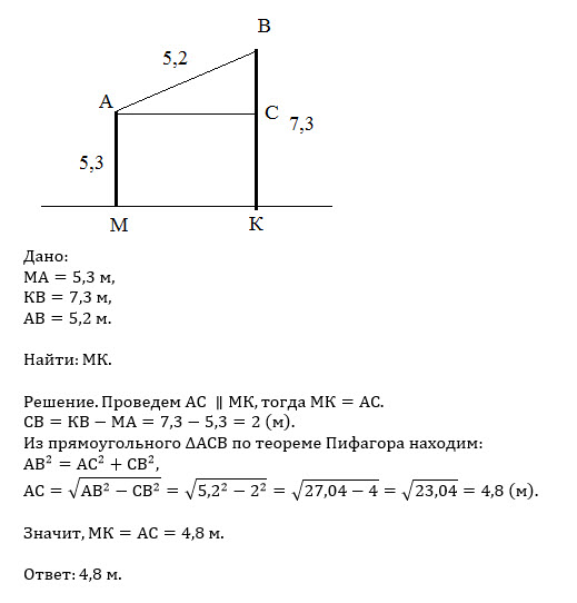 С верхних концов двух вертикальных колонн протянули трос длиной 5,2 м. Высота колонн - 5,3 и 7,3 метра. Найдите расстояние между колоннами.