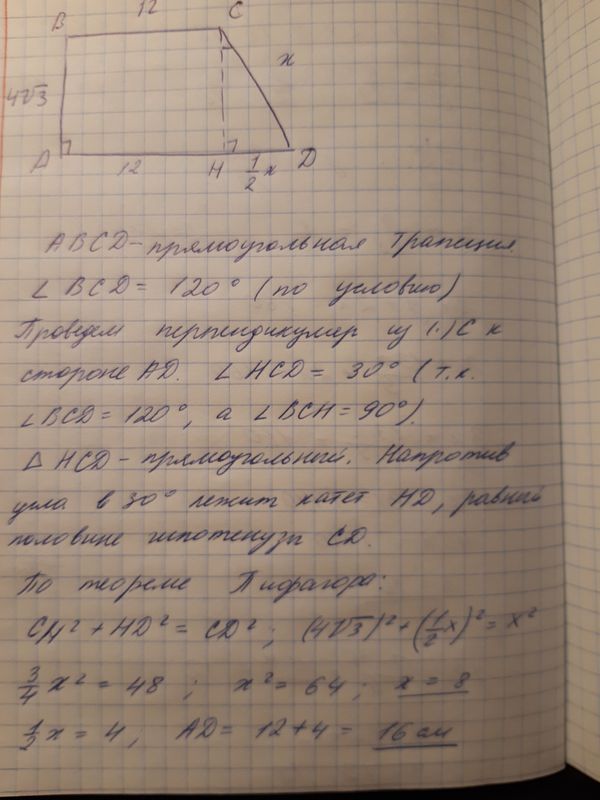 В прямоугольной трапеции меньшая боковая сторона равна 4√3 см, тупой угол равен 1200, меньшее основание 12 см. Найти большее основание.