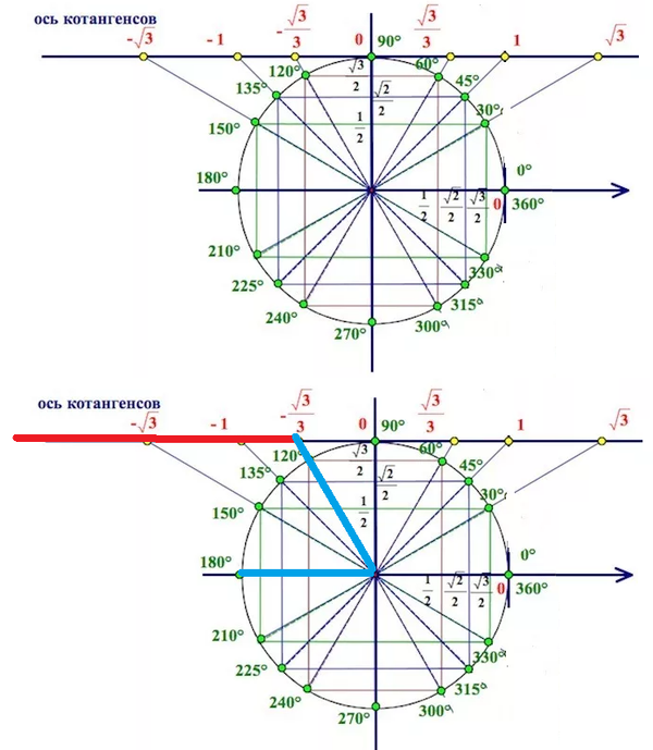 На линии котангенсов отмечаем точку [m] -\frac{1}{\sqrt{3}}= -\frac{\sqrt{3}}{3}[/m]