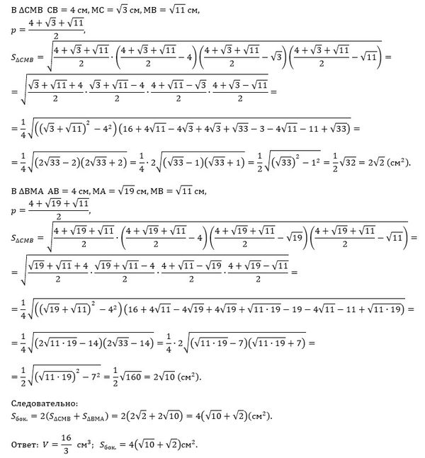 Основанием пирамиды МABCD является квадрат АВCD со стороной АВ = 4 см; точка К лежит на диагонали AC, причем КА = 3KС, МК – высота пирамиды; МС = √3 см. Найдите: 1) объем пирамиды; 2) площадь боковой поверхности пирамиды.