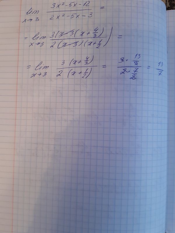 2.[m]\lim_{x\to 3} \frac{3x^2–5x–12}{2x^2–5x–3}=\lim_{x\to 3}\frac{3(x-3)(x+\frac{4}{3})}{2(x-3)(x+\frac{1}{2})} = \lim_{x\to 3}\frac{3(x+\frac{4}{3})}{2(x+\frac{1}{2})} = \lim_{x\to 3}\frac{3x+4}{2x+1} = \frac{13}{7}