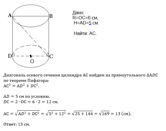 3.12. Радиус основания цилиндра равен 6 см, а высота - 5 см. Найдите диагональ осевого сечения цилиндра.