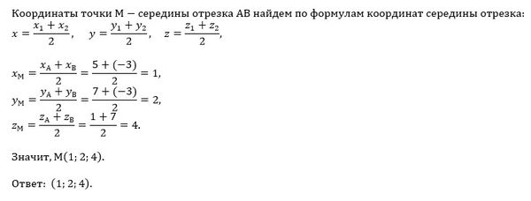 Найти середину отрезка AB, с координатами точек A(5; 7; 1) и B(-3; -3; 7)