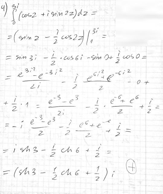 Вычислить интеграл от 0 до 3i ∫(cosz+isin2z)dz по отрезку прямой.