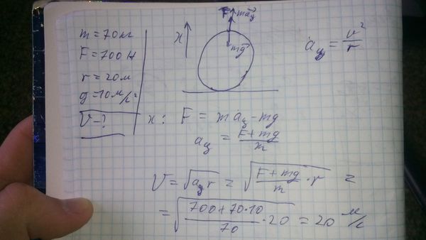 В аттракционе человек массой 70 кг движется на тележке по рельсам и совершает «мертвую петлю» в вертикальной плоскости. С какой скоростью движется тележка в верхней точке круговой траектории радиусом 20 м, если в этой точке сила давления человека на сидение тележки равна 700 Н? Ускорение свободного падения принять равным 10 м/с