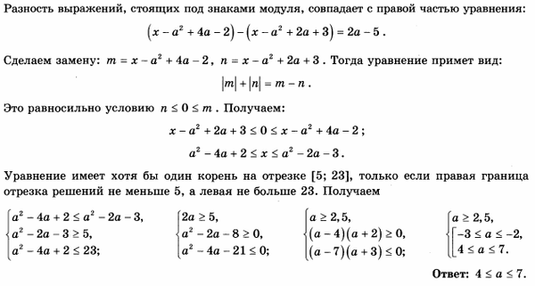 Найдите все значения а, при каждом из которых уравнение |x-a^2+4a-2|+|x-a^2+2a+3|=2a-5 имеет хотя бы один корень на отрезке [5; 23].