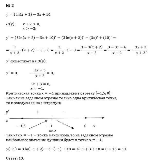 Найдите наибольшее значение функции y = 3ln(x+2)-3x+10 на отрезке [–1,5; 0]