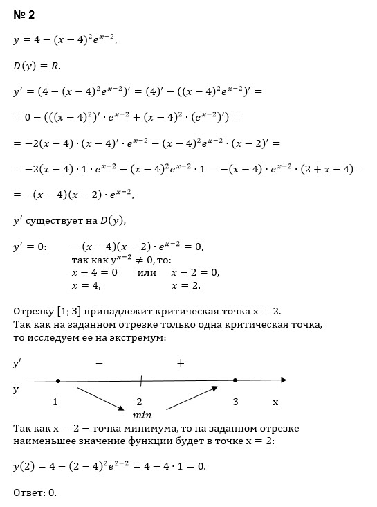 Найдите наименьшее значение функции y = 4-(x-4)^2e^(x-2) на отрезке [1; 3]