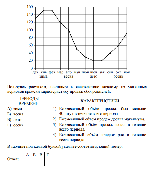 На рисунке точками показаны объёмы месячных продаж обогревателей в магазине бытовой техники. По горизонтали указываются месяцы, по вертикали — количество проданных обогревателей. Для наглядности точки соединены линией.