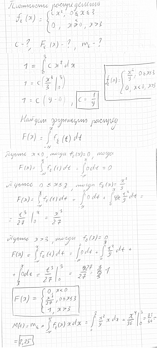 Дана плотность распределения случайной величины e system{cx^2, 0 меньше или равно x меньше или равно 3; 0, x<0, x>3} Найти константу c, функцию распределения F(x) и математическое ожидание m.