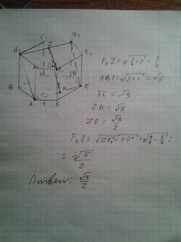 В правильной шестиугольной призме ABCDEFA1B1C1D1E1F1 сторона основания=1 ,а боковое ребро =2 . Найдите расстояние от точки F1 до плоскости AB1D1