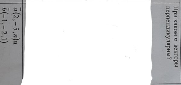 Ненулевые векторы перпендикулярны если их скалярное произведение равно 0 vector{a}*vector{b}=2*(-1)+(-5)*(-2)+n*1=8+n 8+n=0 n=[b]-8[/b]