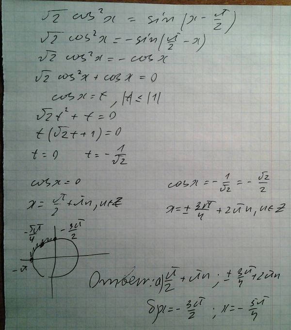 a) Решить уравнение sqrt(2)cos^2x=sin(x-Pi/2) б) Найдите все корни на промежутке [-3Pi/2;-Pi]