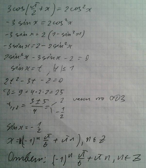 Решите уравнение 3cos(Pi/2+x)=2cos^2x...
