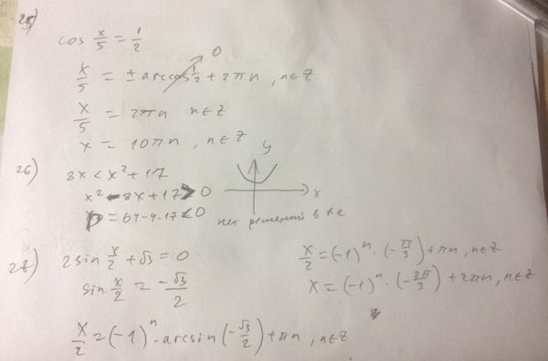 Решить уравнение cos(x/5)=1/2) Решить неравенство 8x меньше x^2+17 Решить уравнение 2sin(x/2)+sqrt(3)=0