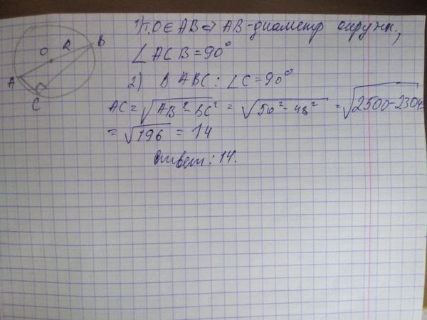 Центр окружности описанной около треугольника ABC лежит на стороне AB радиус окружности равен 25. Найдите ac если BC=48