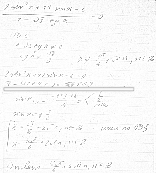 Решить уравнение (2sin^2x+11sinx-6)/(1-sqrt(3)tgx)=0