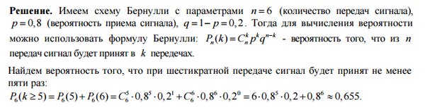 Вероятность приема радиосигнала при каждой передаче равна 0,8. Найти вероятность того, что при шестикратной передаче сигнал будет принят не менее пяти раз.
