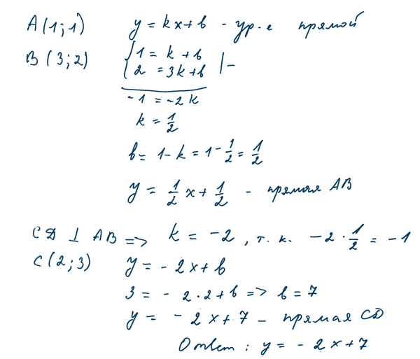 напишите уравнение прямой , что проходит через точку С (2,3), перпендикулярно прямой АВ A(1,1) B (3,2)