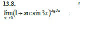 arcsin3x~3x при x → 0 tg3x ∼ 3x при x → 0 [m]lim_{x → 0}(1+arcsin3x)^{ctg3x}=lim_{x → 0}(1+arcsin3x)^{\frac{1}{tg3x}}=lim_{x → 0}(1+3x)^{\frac{1}{3x}}=e[/m]