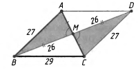 Пусть стороны АВ и ВС треугольника ABC равны соответственно 27 и 29, а его медиана ВМ равна 26. На продолжении медианы ВМ за точку М отложим отрезок MD, равный ВМ. Из равенства треугольников АВМ и CDM следует равенство площадей треугольников ABC и BCD. В треугольнике BCD известно, что