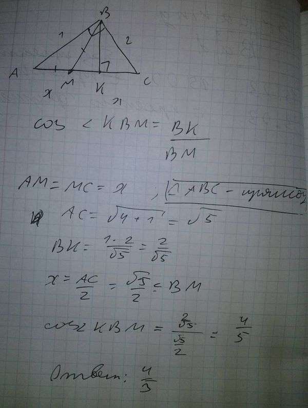 Дан треугольник ABC, BM-медиана, BK-высота, AB=1, BC=2. Найти косинус KBM?