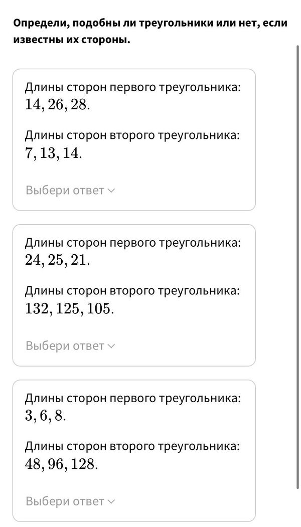 Так как 14/7=26/13=28/14=2, то треугольники подобны.