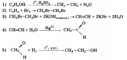 Напишите уравнения реакций, с помощью которых можно осуществить следующие превращения: этанол -> X1 --(Br2)--> X2 --(изб. KOH (спиртов), t)--> ацетилен --(H2O, Hg^(2+))--> X3 -> этанол При написании уравнений реакций используйте структурные формулы органических соединений.