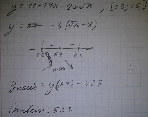 Найдите наибольшее значение функции y=11+24x-2x*sqrt(x) на отрезке [63,65]