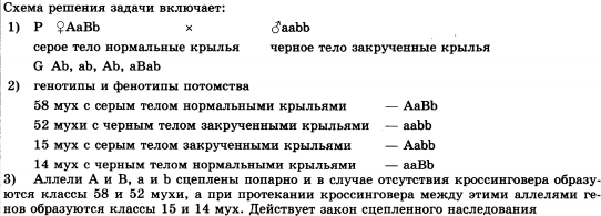 При скрещивании мухи дрозофилы, имеющей серое тело (А) и нормальные крылья (В), с мухой, имеющей черное тело и закрученные крылья, получено 58 мух с серым телом и нормальными крыльями, 52 — с черным телом и закрученными крыльями, 15 — с серым телом и закрученными крыльями, 14 — с черным телом и нормальными крыльями. Составьте схему решения задачи. Определите генотипы родительских особей, потомства. Объясните формирование четырех фенотипических классов. Какой закон действует в данном случае?