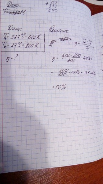 Температура нагревателя теплового двигателя, работающего по циклу Карно, 327 °С, температура холодильника 27 °С. Чему равен КПД теплового двигателя?