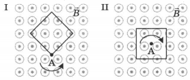 Рамку вращают в однородном магнитном поле, линии индукции которого идут из плоскости чертежа, двумя разными способами (см. рис.). Вращение происходит вокруг точки А в плоскости рисунка.