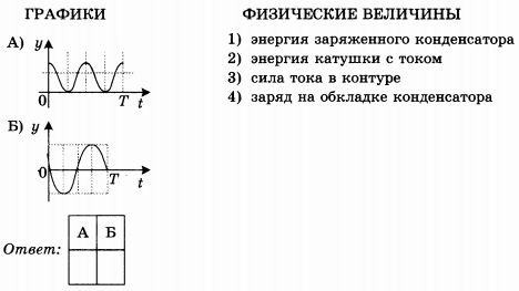 Сила тока в контуре в начальный момент времени равна нулю, а заряд на обкладках конденсатора максимален, следовательно, график Б) — это график зависимости силы тока в контуре от времени.