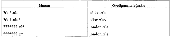 Для групповых операций с файлами используются маски имён файлов. Маска представляет собой последовательность букв, цифр и прочих допустимых в именах файлов символов, в которых также могут встречаться следующие символы: символ «?» (вопросительный знак) означает ровно один произвольный символ; символ (звёздочка) означает любую последовательность символов произвольной длины, в том числе (звёздочка) может задавать и пустую последовательность.