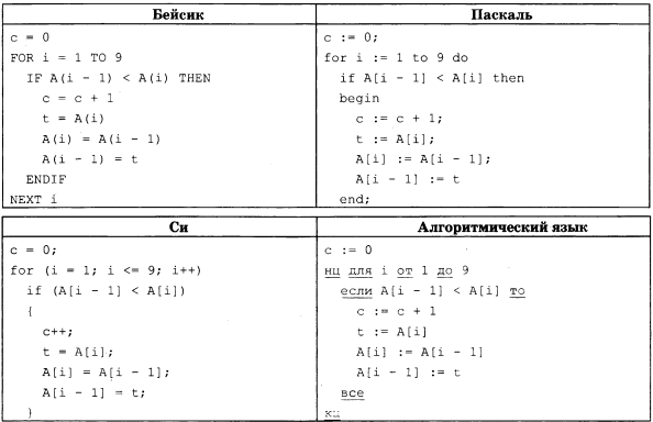 Видно, что первоначально значение переменной с равно нулю. В цикле сравниваются пары элементов. В том случае, если предшествующий элемент меньше последующего, значение переменной с увеличивается на единицу, а элементы меняются местами. В данном массиве это произойдет 6 раз: поменяются местами 5 и 8, 5 и 7, 1 и 4, 0 и 3, 0 и 4, 0 и 8. Таким образом переменная с после выполнения алгоритма будет иметь значение 6.