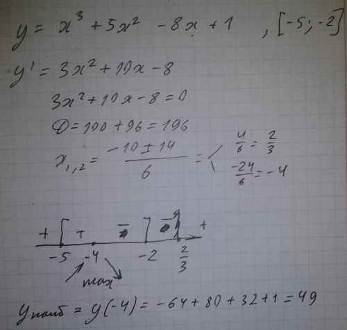 Найти наибольшее значение функции y=x^3+5x^2-8x+1 на отрезке [-5;-2].