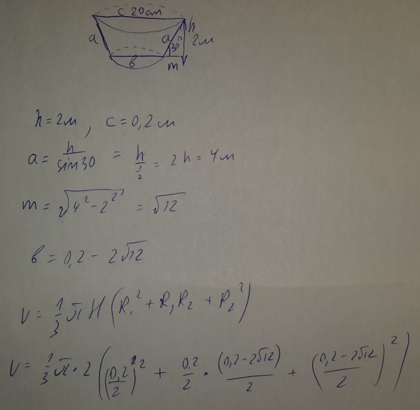 Вырат водоем имеющий форму усеченого конуса у которого диаметр верхнего основания 20м а высота 2 м сколько кубических метров земли вырота если берег водоема образует с горизонтом 30градусов