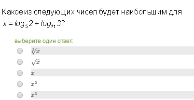 Какое из следующих чисел будет наибольшим для x = log52+log(11)3