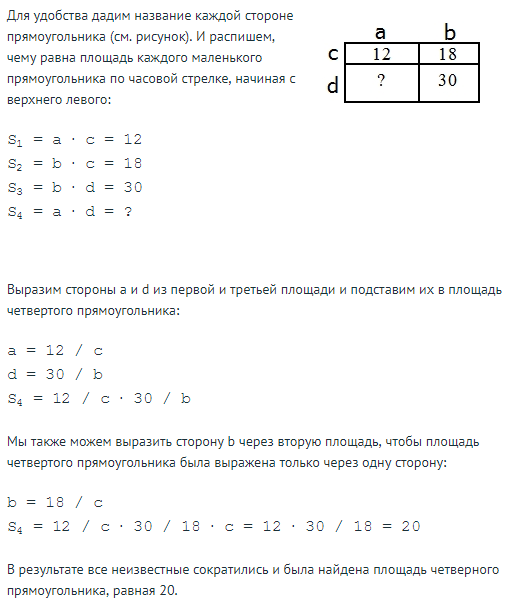 Прямоугольник разбит на четыре маленьких прямоугольника двумя прямолинейными разрезами. Площади трёх из них начиная с левого верхнего и далее по часовой стрелке равны 12, 18 и 30. Найдите площадь четвёртого прямоугольника.
